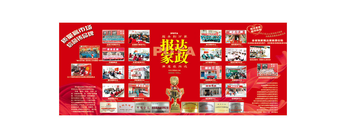 现发展成为拥有1个总部,17个直营连锁店,1所培训学校,近100余名管理员,3000余固定计时服务员,2000余专业月嫂、保育员,2万多家庭服务员的规模化家政服务企业。成为黑龙江省家庭服务业市场最具实力、社区网络经营区域覆盖面最广、服务项目最多的家政公司之一,已成为哈尔滨市家政业的龙头企业。
