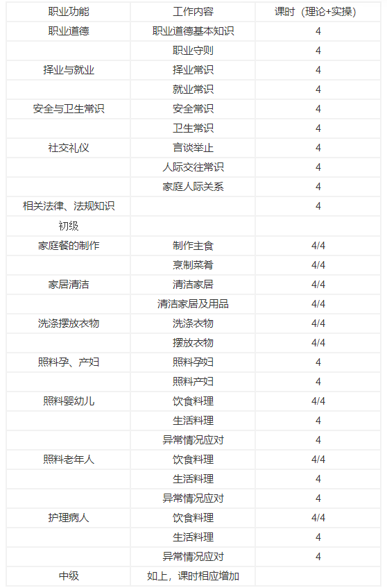 本岗位培训项目分为三级:初级家政服务员、中级家政服务员、高级家政服务员。
